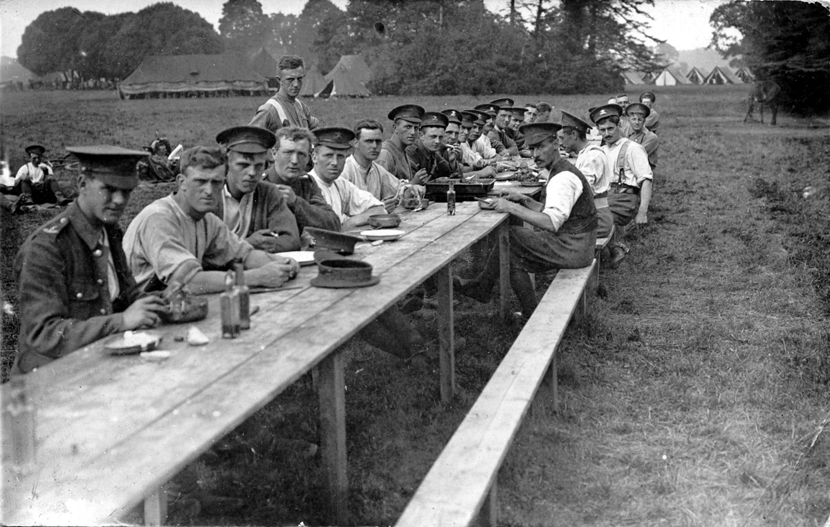 This picture is dated 20th May 1916 and shows soldiers of the Norfolk Regiment having dinner near the parish church of Fornham St Martin. |