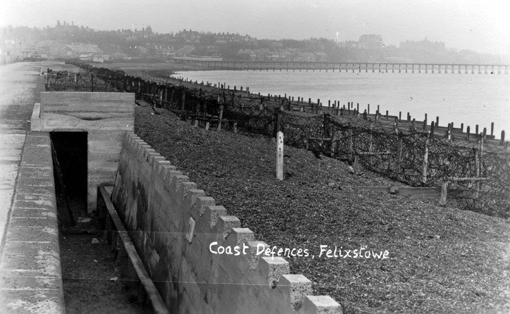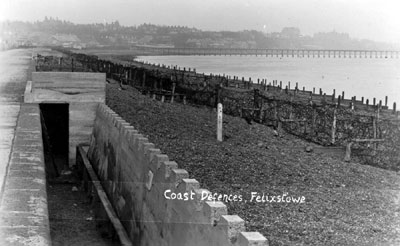 It was now clear that existing coastal defences like these at Felixstowe could not stop a Zeppelin attack. It would later become clear that a naval bombardment could not be prevented, either. Postcard by Emeny of Felixstowe.
