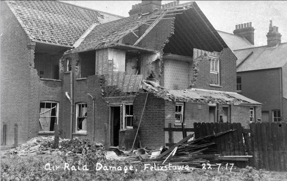 Felixstowe and Harwich was attacked by air on 22nd July, 1917. Fifty five bombs were dropped, but Harwich had no casualties. Felixstowe, however, suffered casualties and extensive damage.