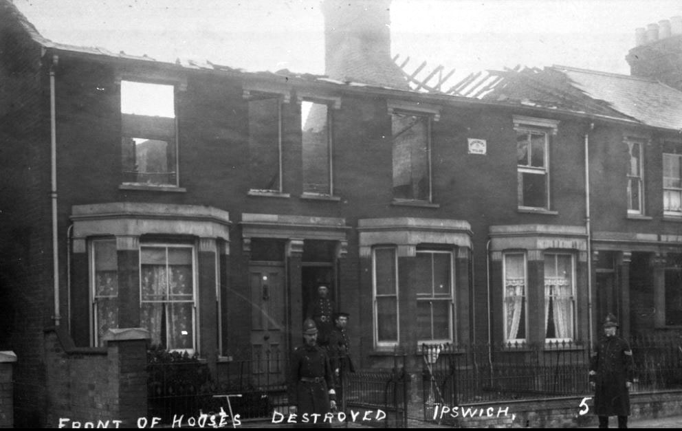 Ipswich was attacked by Zeppelin LZ38 on April 30th 1915 with two explosive and three incendiary bombs. Three houses were burnt out at Rosebery Villas, but residents escaped without injury. Theses addresses are believed to be numbered 56, 58 and 60 Rosebery Villas, Brooks Hall Road, Ipswich.