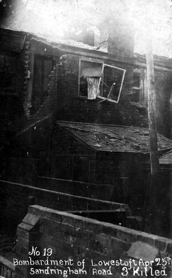 Three deaths occurred at this house in Sandringham Road, Road, Lowestoft, arising from the naval bombardment on April 25th, 1916. No publisher details, but, "British Manufacture Throughout."