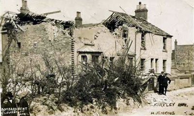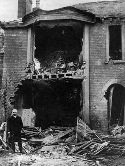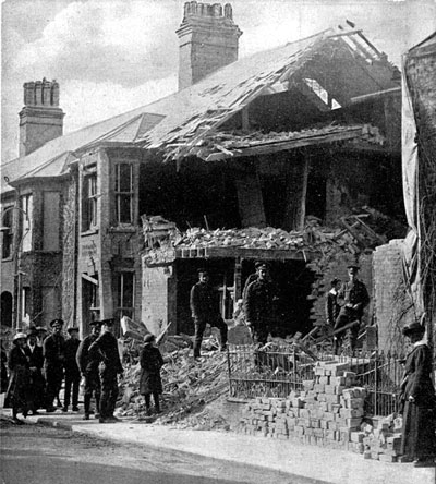 Ipswich attacked on April 30th 1915. This is another view of the same properties at Rosebery Villas in Brooks Hall Road hit by an incendiary bomb. Great Yarmouth had been attacked on the same night, and, after bombing Ipswich Zeppelin LZ38 then proceeded along the A45 to attack Bury St Edmunds. (See page 4a for the damage at Bury)