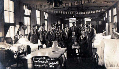 At first the normal hospital facilities took battle casualties. But there was soon an overwhelming need for more facilities and local mansions were requisitioned wholly, or in part, to be converted to hospitals. Picture in West Suffolk Hospital by Walton Burrell, negative 2052. (Gerald Brown collection.)