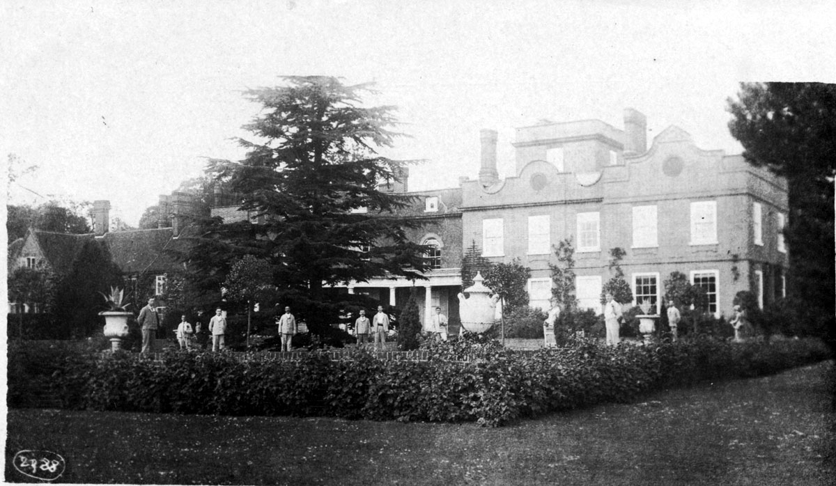 Hardwick House was not totally commandeered for use by troops, and continued to be the home of George Gery Milner-Gibson-Cullum. The grounds of Hardwick House were used for training purposes, and the front lawns turned into hay meadows for forage for horses and other animals. Other parts of the estate were farmed for food. Members of the Signals Regiment seem to have been based at Hardwick, and wounded soldiers were often entertained there on days out from Hengrave Hall Hospital. Cullum allowed convalescent troops to wander in the grounds of Hardwick House and often invited parties over for tea, as seen here. (Gerald Brown collection.)