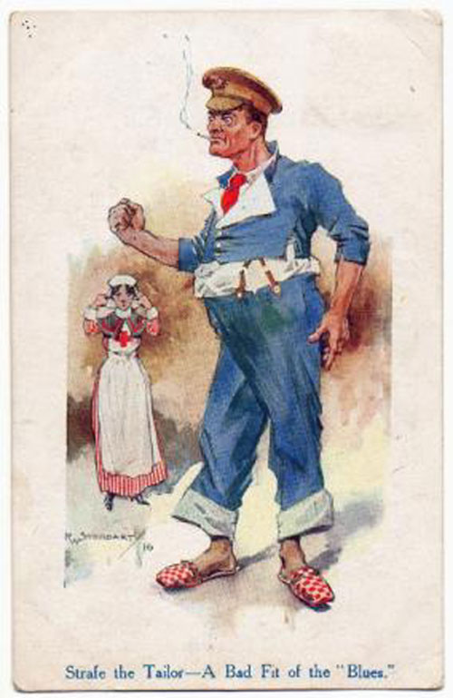 This comic postcard clearly shows the issues surrounding the uniform known as 'Hospital Blues'. Issued to men in hospital, the uniform was coloured blue, with a white lining, but had no pockets and was ill fitting. Hospital uniform included a red tie and a white shirt as shown here. |