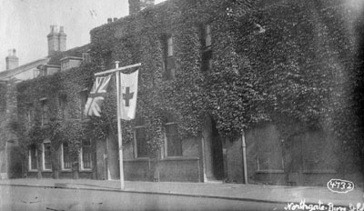 This Red Cross hospital was set up in Northgate Street, Bury St Edmunds. This photograph shows it during 1917. The Record Office description reads, " Photograph "Closed 2 January 1923" View of the hospital with flag pole flying Union Jack and Red Cross".