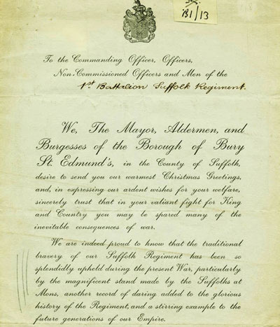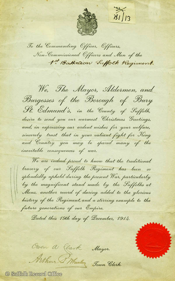 As the first Christmas of the war arrived, people on the Home Front were keen to send messages of support to their loved ones overseas. Even the local Council felt it appropriate to express their support for the troops. This letter, dated 19th December 1914, was sent to the 1st Battalion, the Suffolk Regiment from the Mayor, Aldermen and Burgesses of Bury St Edmunds sending them greetings and support. It is clear from the format of the letter that the same sentiments were dispatched to every Suffolk Battalion in the field. (SRO)