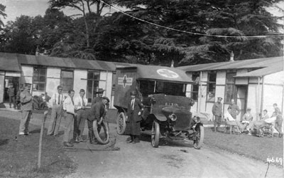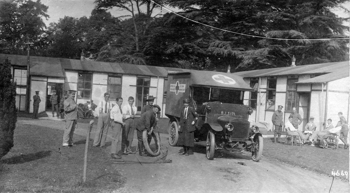 This WB Photograph shows a Red Cross Ambulance in front of the temporary hospital hut wards at Ampton Hall Red Cross hospital. The ambulance has a woman driver, but her name is unrecorded. We do know that one of the very few women drivers was Dorothy Goulding, of the 41st Detachment of the Suffolk Red Cross Society, whose day job was delivering groceries around Clare in a Ford Model T van. Up to three times a week she would answer a call for volunteers to drive the wounded from Ingham station to hospital at Ampton Hall. This could be as late as 3am, after which she returned to Clare to attend to her deliveries at 6am. Her detachment was called out for 40 of the 92 convoys. She became Mrs Monty Mills of Wickhambrook Garage in 1922.