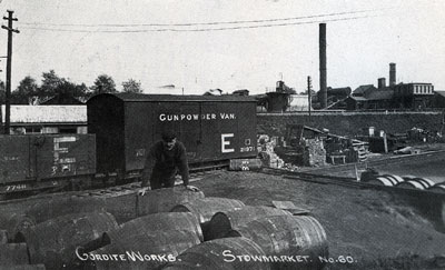 The Cordite Factory at Stowmarket. This postcard was posted in 1915, and shows the long established explosives works at Stowmarket. Explosives had been made in Stowmarket since 1864, and the works had experienced a devastating explosion in 1871. The factory had its own sidings and we see the Gunpowder Van clearly marked for safety, and barrels waiting to be loaded. These were sometimes combined into complete train loads and sent to the Woolwich Arsenal for use in bullets or shells, or other types of ammunition. (Picture from "Suffolk's Railways" by Dennis Cross, 1993.) |
