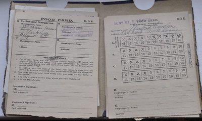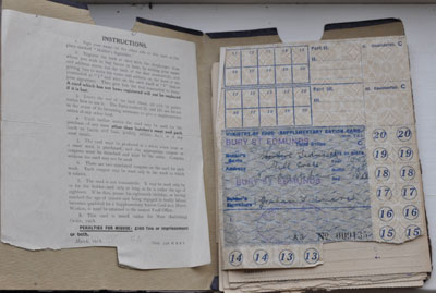 Butter and Margerine were also rationed so another card was issued for those commodities. Here the retailer is the Maypole Dairy on the Cornhill at Bury St Edmunds.Butter and margerine were rationed on 14th July, 1918, along with lard. Lard came off ration in December, 1918. Margerine was rationed up to 16th February, 1919, and butter until 30th May, 1920. (Martyn Taylor Collection.) |