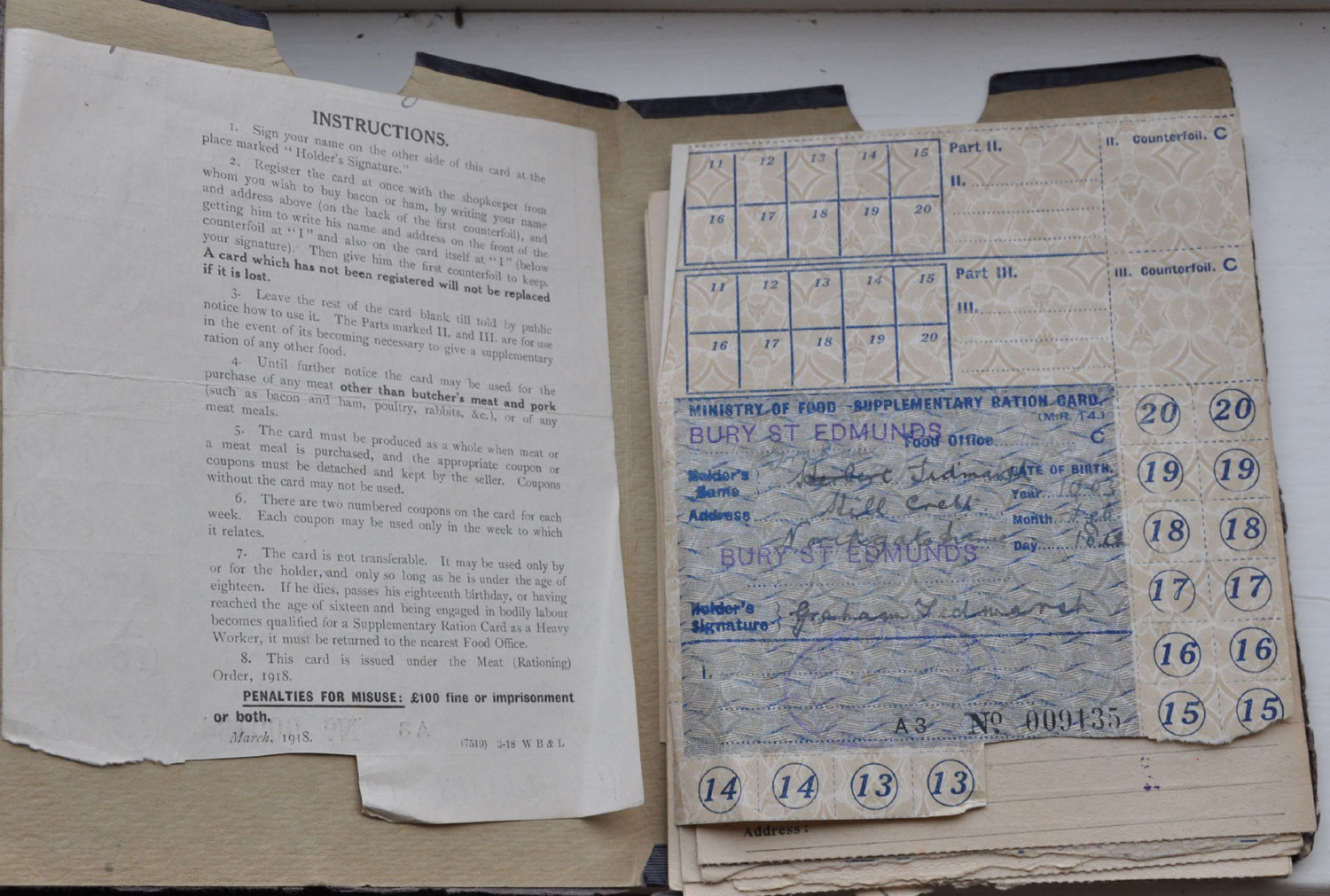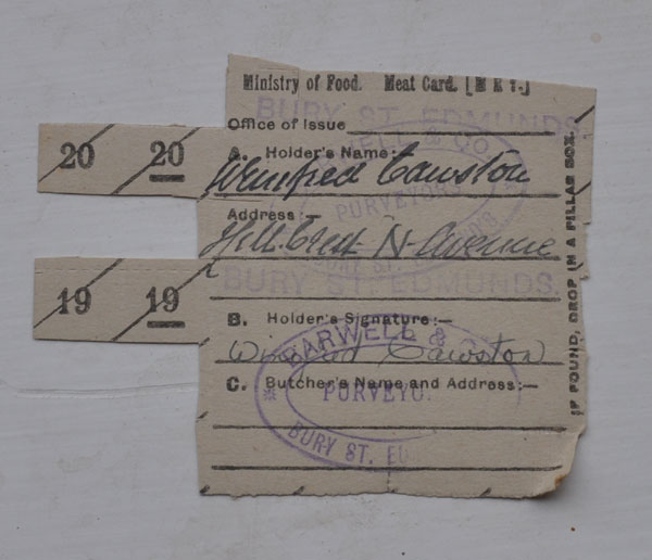 This shows a meat ration card issued to Graham Tidmarsh of Hill Crest, Northgate Avenue, Bury St Edmunds. There were nine people at this address entitled to rations. Tidmarsh was registered to buy his rationed meat only from Barwells.