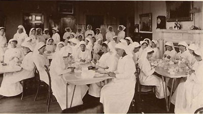 This postcard shows the nurses at Saxham Hall in their Dining Room. They are clearly wearing different uniforms to the VAD at Ampton Hall.