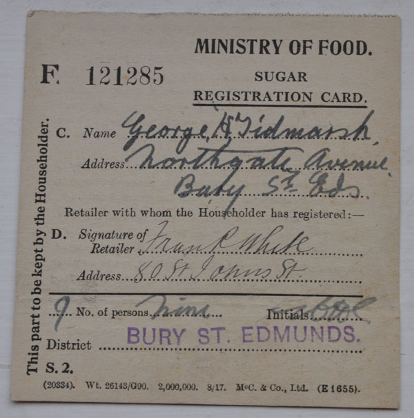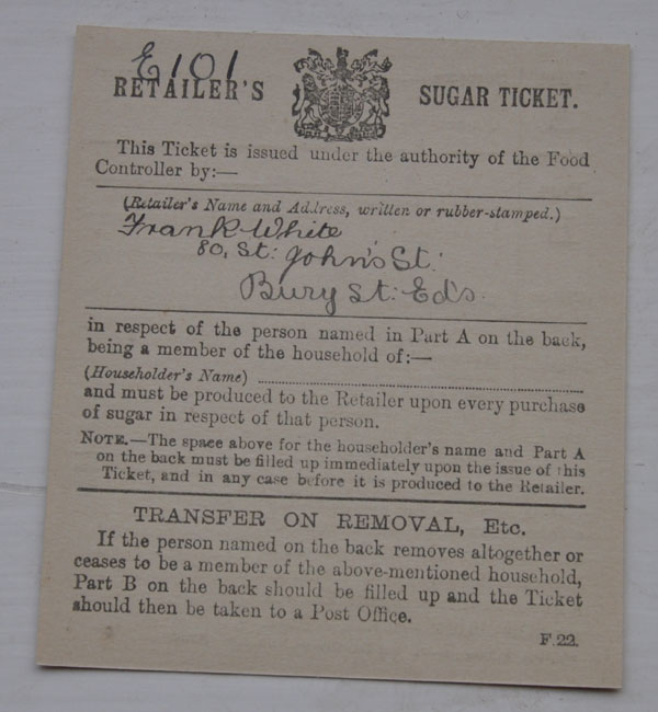 Sugar was also rationed so another card was issued for this. Sugar was vital because of its preservative qualities for bottling fruit , jam making, etc. This retailer was Whites in St Johns Street.Sugar was rationed from 31st December, 1917 until 29th November, 1920. Even jam went on ration from 2nd November, 1918 until 15th April, 1919. (Martyn Taylor Collection.) |