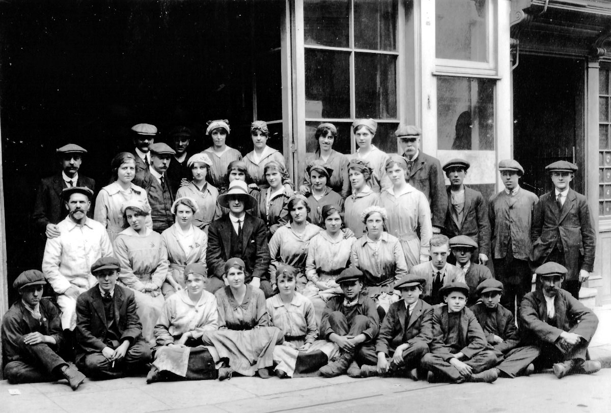 The garage of T H Nice in Abbeygate Street was engaged in war work. Many peacetime businesses, both large and small, were turned over to war production during the Great War. Thomas H. Nice & Co. had premises at 21 Abbeygate Street and as motor engineers and cycle makers on the Angel Hill. Pictured here in 1916 are the staff during the First World War when the Abbeygate Street premises were used as a munitions factory. (Martyn Taylor Collection)