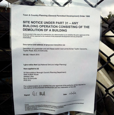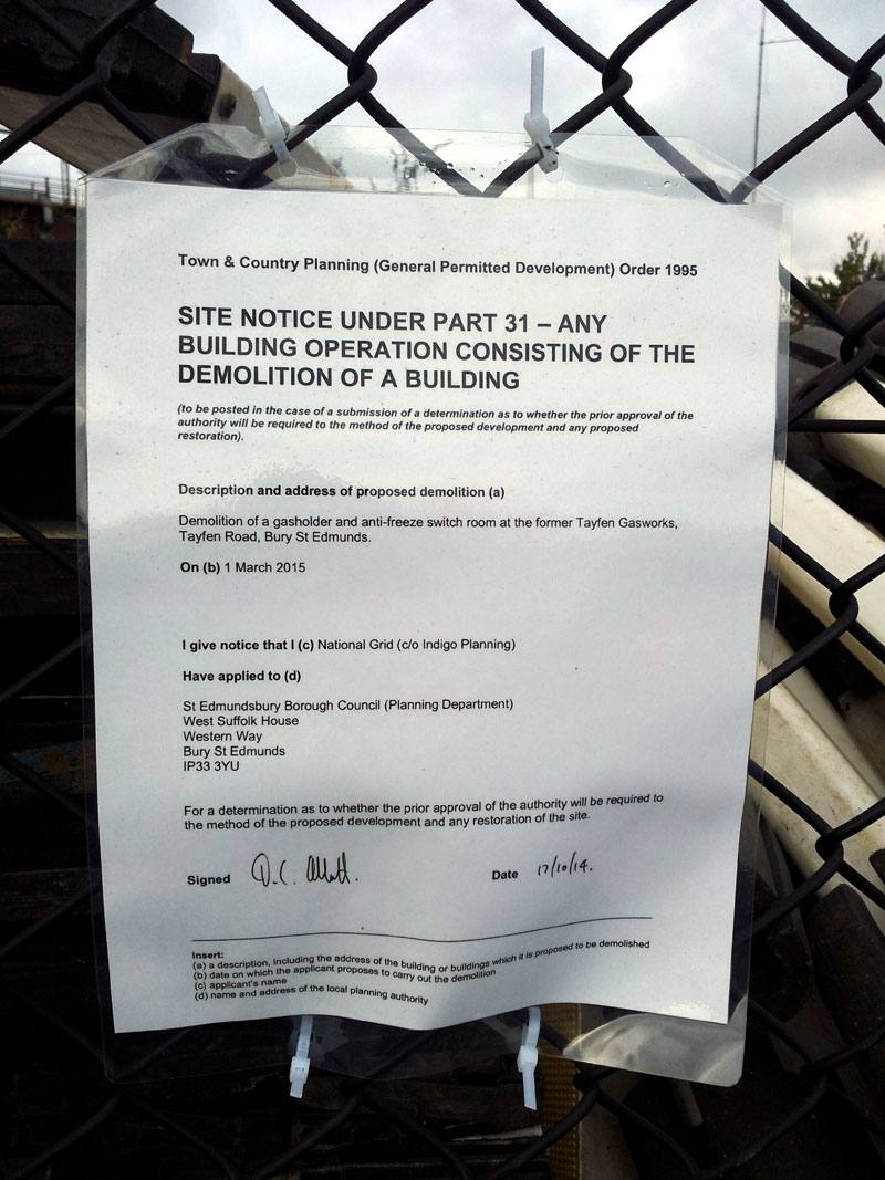 This was the first notice given of the demolition of the gasholder. In October, 2014, it was fixed to the front gate of the remaining gas depot site in Tayfen Road. Demolition was scheduled for March, 2015, but it did not in fact begin until November, 2015. |