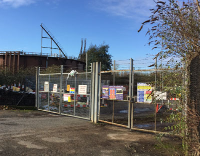 Eventually, by November, 2015, three new notices were fixed to the site gate which explained some of the history of the gasholder, and described the way in which its demolition would be carried out. Unfortunately the left hand notice was quickly vandalised and torn down. |