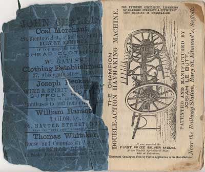 Guide Book inside cover with small ads and Josiah Le Butts Haymaker. |