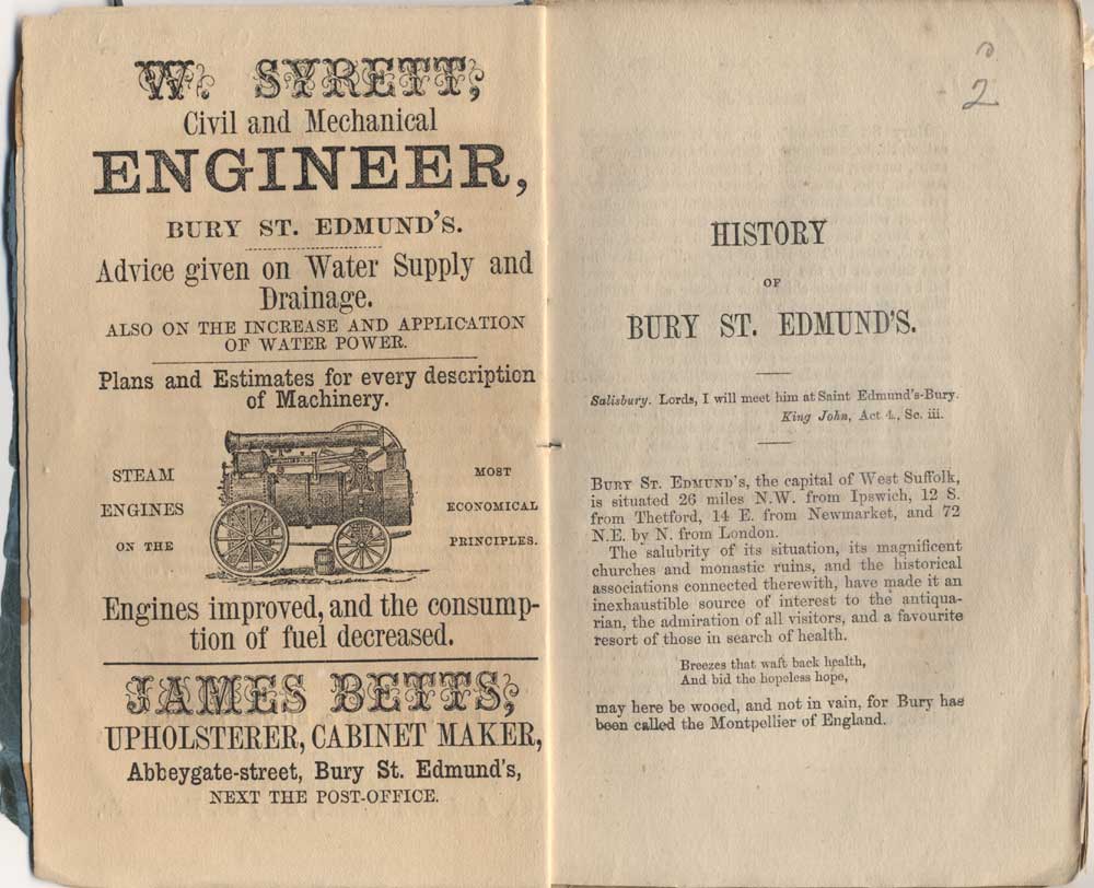 Pages d and 1. W Syrett's advert opposite page 1 of the History of Bury. |