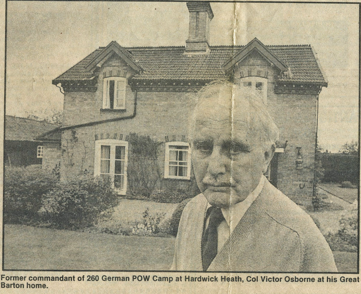 Also interviewed were the Camp Commandant, Colonel Victor Osborne now retired of Great Barton. "Initially there were Italians there. They left and the Germans arrived soon after", he told the BFP. He was responsible for over 2000 prisoners at both Hardwick and its village satellites.