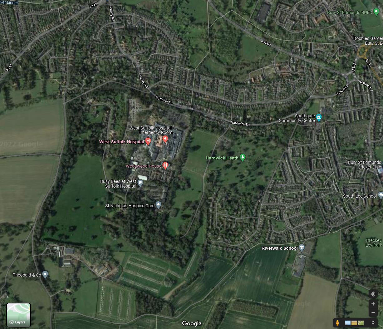 Using Google Earth shows us a birds eye of the Hardwick area, as seen in 2022. The area of public open space as it is today is labelled Hardwick Heath. It is wrapped around by private housing on the right of the view, off Home Farm Lane. The central area is dominated by the West Suffolk Hospital and the St Nicholas Hospice. At the bottom are the parallel lines of pheasant pens of the Hardwick Game Farm. To the left of the hospital is another open space made up of Hardwick Manor - land now designated for a new hospital. Between Hardwick Manor and the hospital is Sharp Road, another development of private housing.