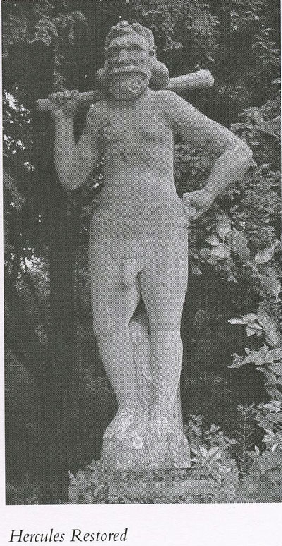 At Hawsted the villagers had the idea to produce a village survey to celebrate the millennium in the manner of a local Domesday Book. By now the village was spelled with an "A", thus "Hawstead 2001" was the name whch they published their great survey under. This lavish publication of 280 pages covered all aspects of the parish, its industry, church and people. The entry for Hawstead Place Farm by Ben Powell included mention of the statue "Hercules". The broken and dismembered statue was rescued in the 1960s by Oliver Powell and was eventually repaired by Michael Black, a sculptor. He was unveiled in 1978, some 400 years after the visit of Queen Elizabeth I.