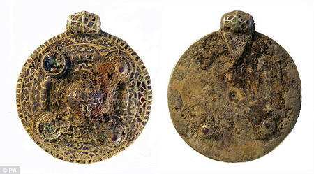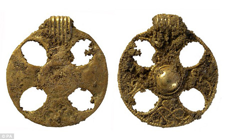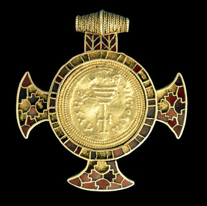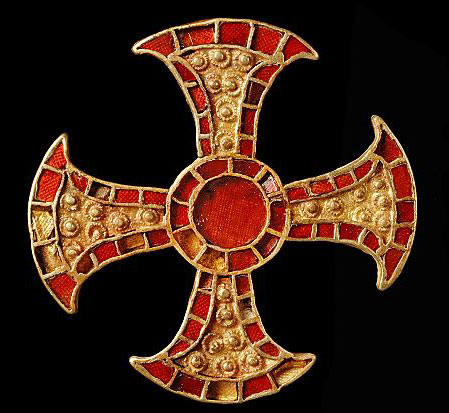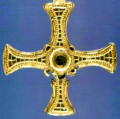 St Cuthbert died in the year 687, and was buried at the monastery on the island of Lindisfarne. Eventually his body was removed to Durham Cathedral, and in 1827 his tomb was opened and this gold pectoral cross was discovered around his neck. This cross must date from a similar period to the Ixworth Cross, but presumably was made in a Northern workshop. St Cuthbert's cross is inlaid with garnets, just as in our cross, and the overall shape is similar. The association of such a cross with a Bishop, as Cuthbert became in 685, may indicate that the Ixworth Cross could have a similar background. Was the Ixworth Cross also the property of a Bishop or similar highly placed churchman? |