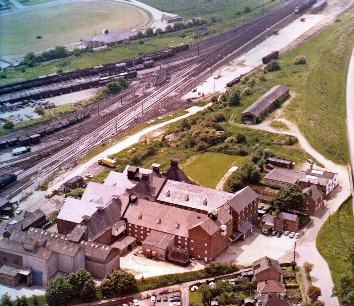 The asbestos buildings on the bottom left are the barley silos. These are linked to the red brick barley drying kiln (with two kiln cowls) then comes the full length of the new house maltings (built in 1890) with the Old house maltings beyond (built in 1885) and beyond that the single cowl of the malt redry kiln.