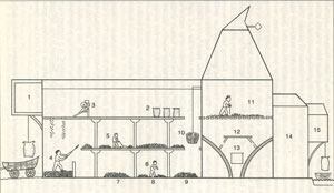 The first stage in the malting process, after drying and cleaning is the steeping of the barley in the cistern to begin germination. Early 16th and 17th century steeping cisterns were often lead vessels and not a built-in part of the structure of the malthouse. From at least the end of the 17th century the most usual type of steeping cistern, until the last quarter of the 19th century, was a rectangular trough constructed of stone or brick and made water tight with either lead or later, cement or tiles.