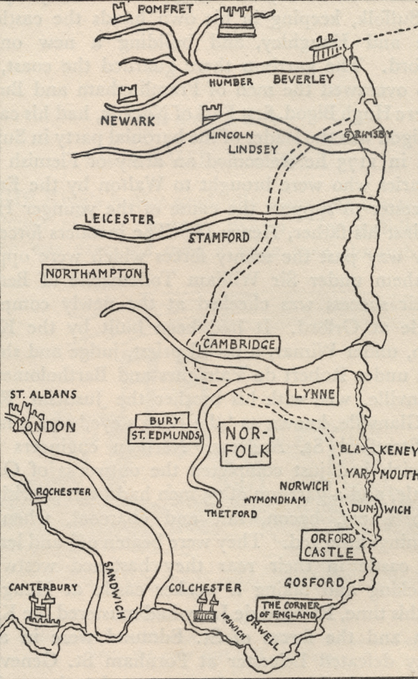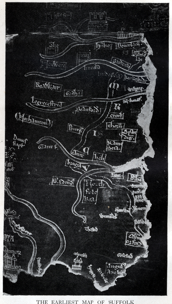 Key to the oldest map, re-drawn and published in Lilian Redstone's "Suffolk" of 1930. The three towered castle at the top of the map represents York. Not all of the markings on the original have been reproduced and translated.