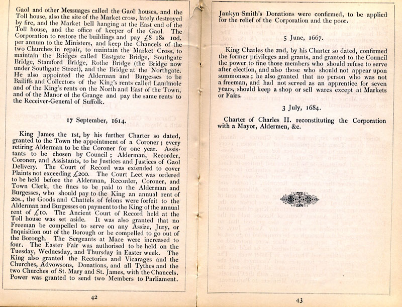 The Town received a final Charter from James I which gave it the right to send 2 MPs to Parliament, to hold a court of quarter sessions, and to have a Coroner. The MP's were elected solely by the 37 members of the corporation, but for many years those chosen were nominees of the Duke of Grafton and the Marquess of Bristol.