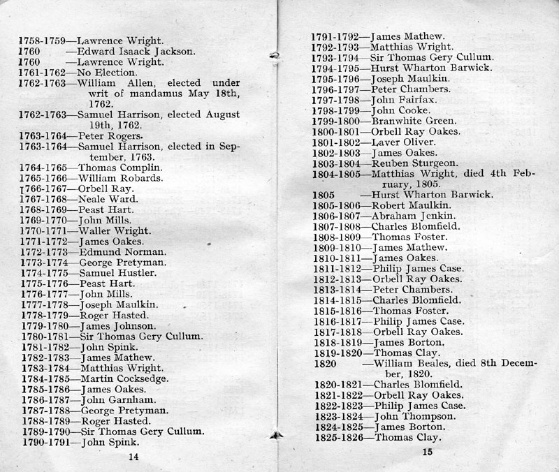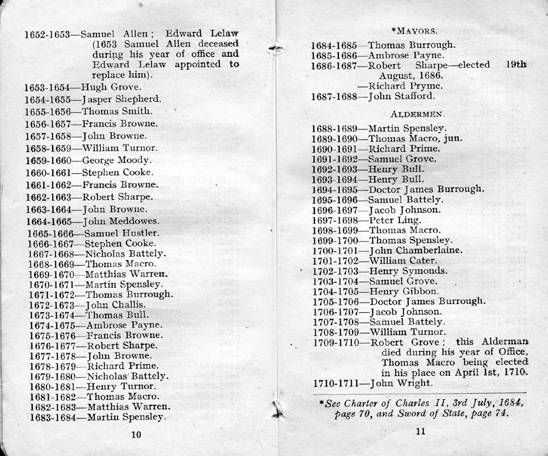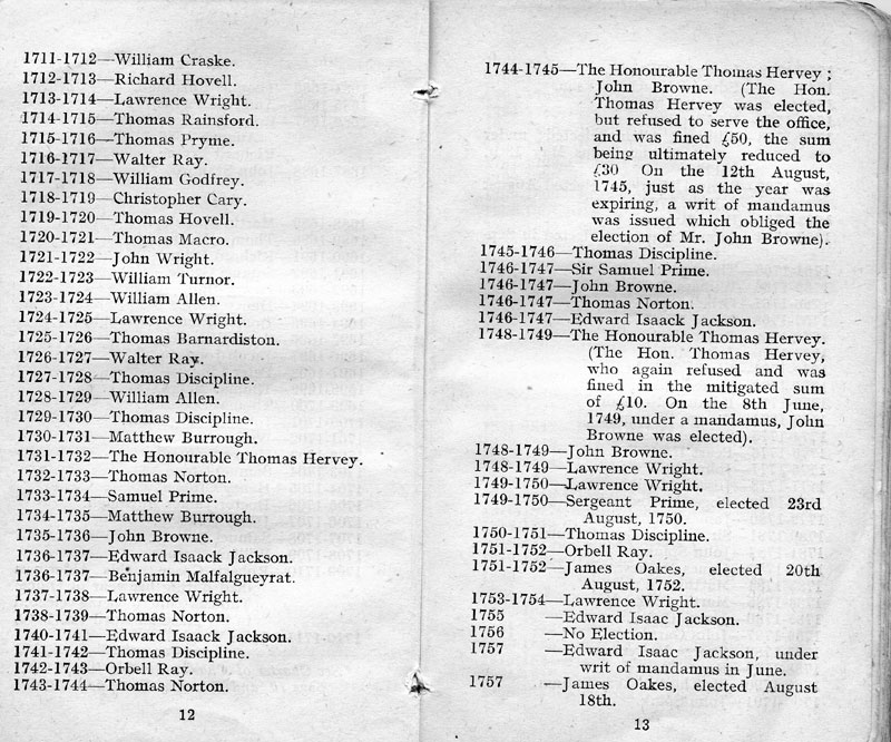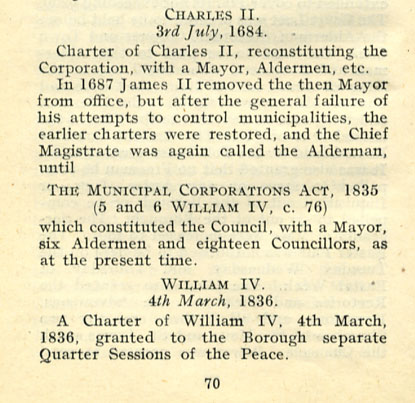 The Corporation could elect four Justices of the Peace and appoint a Town Clerk and a Recorder. The towns' first Alderman was Richard Walker, and he was entitled to be preceded in processions by two Sergeants-at-Mace carrying Maces of gold or silver adorned with the royal coat of arms.