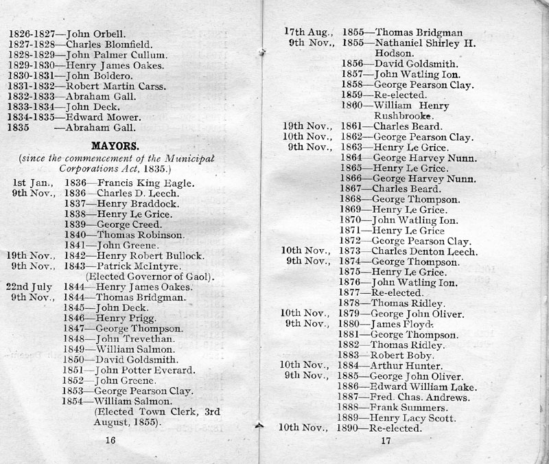 The old corporation was substantially in debt and the last Alderman actually refused to hand over the insignia and plate to the new Council. Eventually a judgement was obtained to enforce this transfer. The first Mayor after the 1835 Act was Francis King Eagle who had been the local radical candidate following the Great Reform Act of 1832.