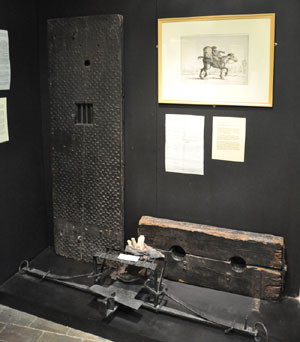 A cell door, some stocks and a man trap illustrate the hazards of a criminal career. |