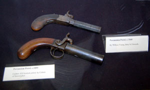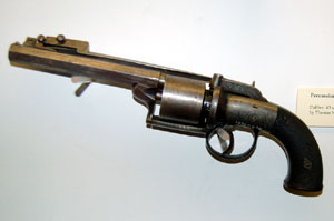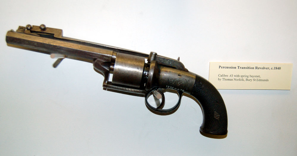 This 0.43 calibre percussion revolver is from about 1840, and includes a spring bayonet. It was made by Thomas Norfolk of Bury St Edmunds. |