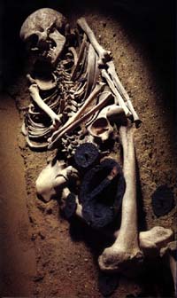 ![]() Man's skeleton, 5th to 7th century AD, from the Anglo-Saxon cemetery at Westgarth Gardens. |