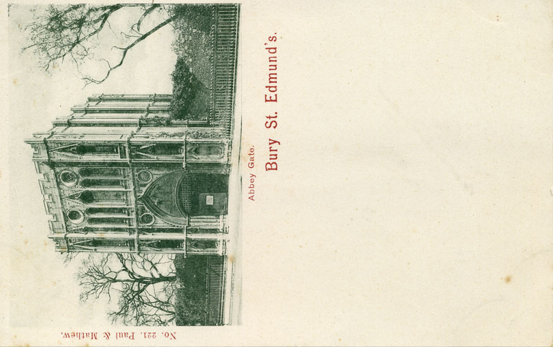 This postcard of the Abbey Gate in Bury, published by Paul and Mathew, illustrates how the picture and the sender's message had to share one side of the card before 1902. The other side was strictly reserved for the words "Post Card" and the address and the stamp only.