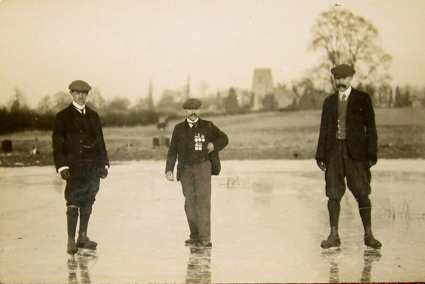 The weather in 1908 provided Burrell with several photo opportunities, beginning with scenes on frozen fields on the farm. The first picture is from January 1908, showing Walton and his brother Frank Burrell on skates. The Farm’s carpenter is brought along to show his medals.