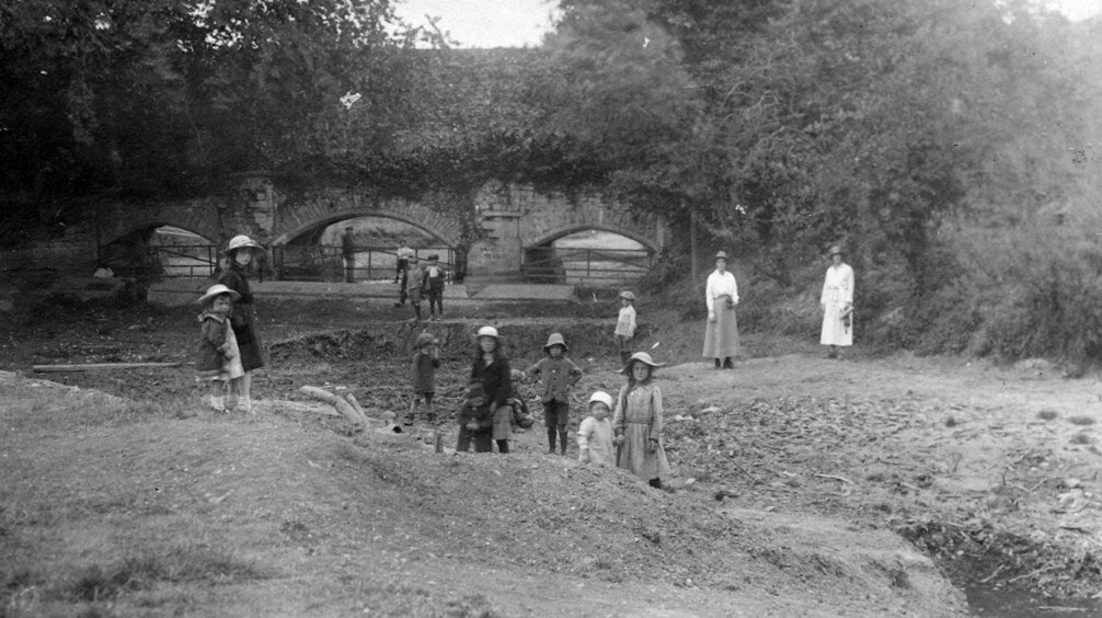 For years Bury residents have referred to the Abbey Gardens as "the Park". The description of this photograph, from the Suffolk Record Office, illustrates that this designation has a long history. The description states, "The river quite empty in the park by the Abbots bridge at Bury during the very long dry weather". In the Abbey Gardens, people could walk along the dry river bed.