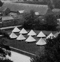 Some of Walton Burrell's pictures survive with precise dating, while others do not. This one is labelled Date 23 May 1918. These Gordon Highlanders are at camp at West Stow, Suffolk. Seven soldiers are seen outside a tent at the army camp, while the 8th man has moved during the exposure and exists only as a blur. Others are visible in the background. It carries negative number 5431.