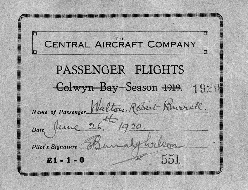 By 1920 the idea of air travel was still new and exciting. It was also easy for the aircraft of the day to take off and land using any flat grass field. Crowds could always be relied upon to turn up to any flying event of the time. On June 26th, 1920, this ticket to enjoy an aeroplane ride for one guinea was issued to Walton Burrell by the Central Aircraft Company. By the 1930s these trips and landing strips had to be properly authorised.