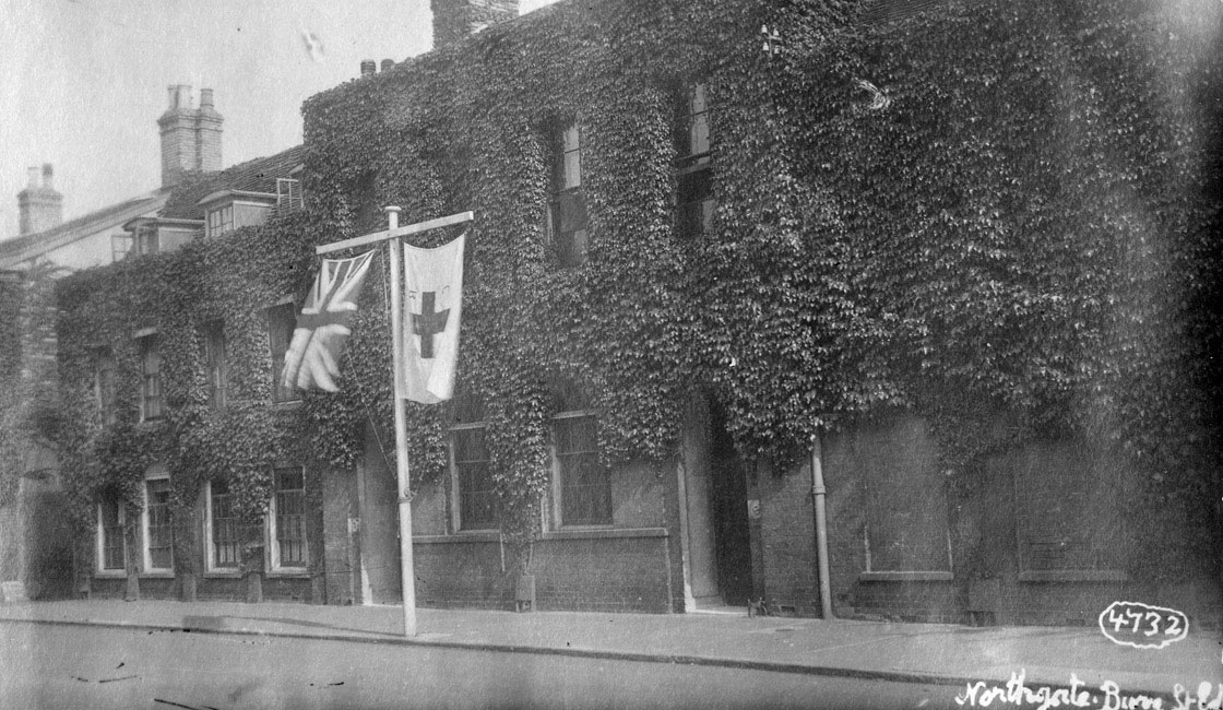 On January 2nd, 1923, the Red Cross Hospital in Northgate Street was closed down. This picture shows the hospital in 1917, negative number 4732, with its flag pole flying the Union Jack and Red Cross emblem.