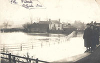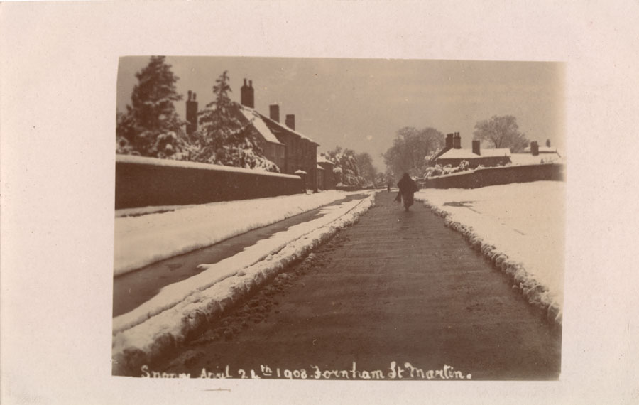On April 23rd - 24th 1908 a freak late snowstorm provided several snow scenes to be made into cards for sale. There was a heavy fall of snow on Easter Monday, April 20th, and the weather remained unseasonably cold. Snow in April is not unusual, but in late April it is most uncommon. This postcard shows the unusual feature of snow and slush on April 24th 1908. The picture was taken at Fornham St Martin, and printed as a postcard. There is no publisher's name on the postcard, but it was certainly produced by Walton Burrell, who lived at Hall Farm in Fornham. Next day, on April 25th, a blizzard raged across southern England.