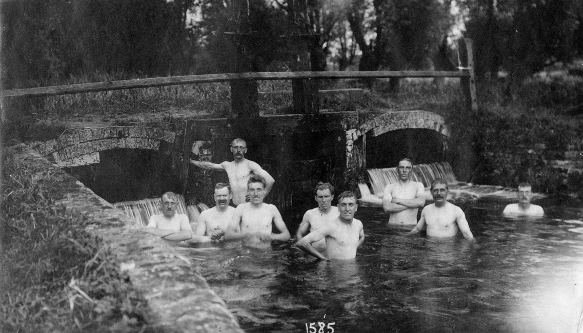 Droughts were not confined to the days of global warming at the end of the 20th century. The summer of 1921 was so dry that the River Lark dried up. This view shows the dry river bed seen from Eastgate Bridge looking north. It is notable how much silt had accumulated in the river bed at this date. Crop yields were drastically damaged by the drought, and although this should have led to a rise in farm prices, the government encouraged cheap imports of foreign food to compensate for the lack of supplies.
