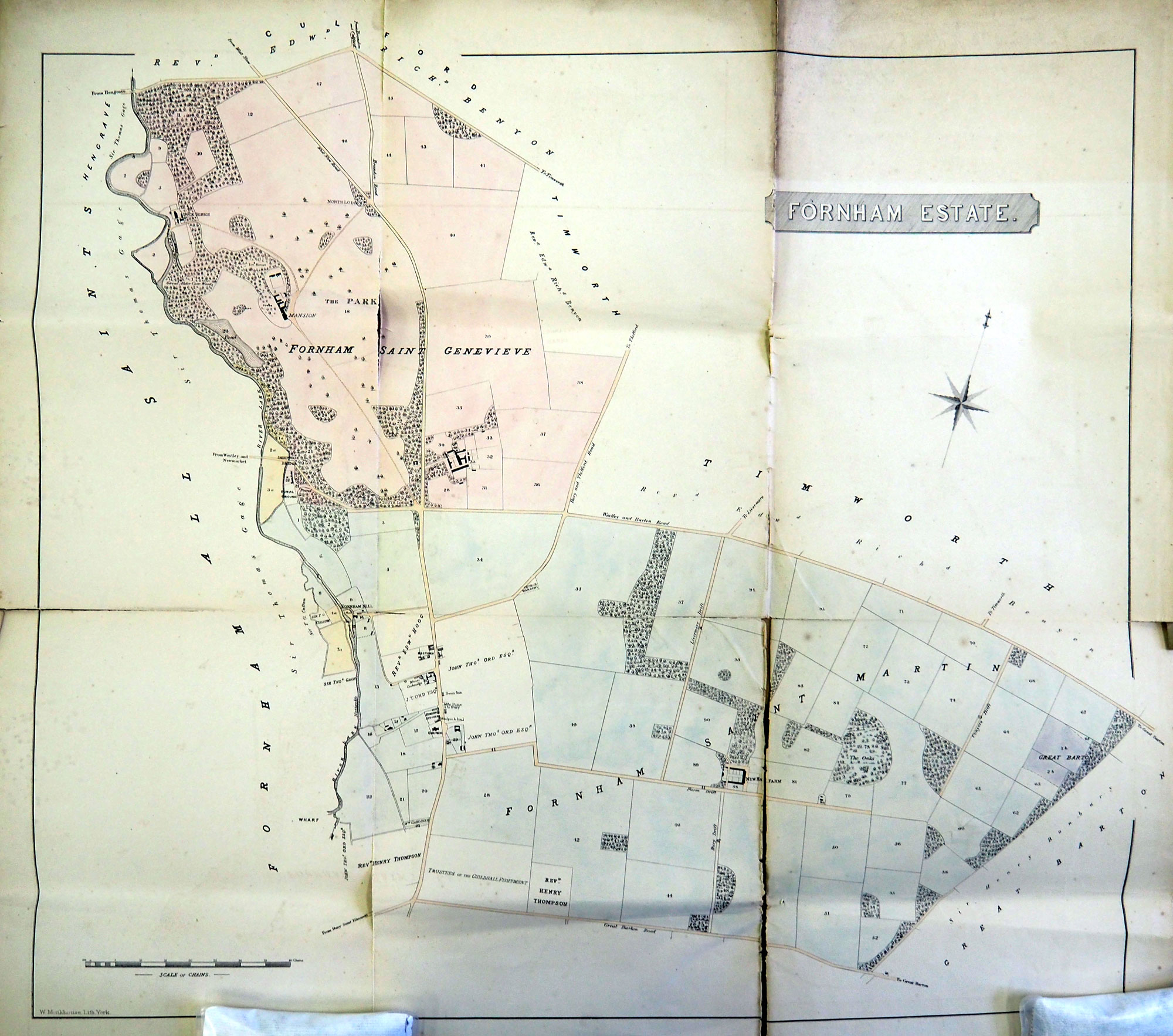New Hall Farm was part of the Fornham Park estate, which since 1843 was owned by Lord John Thomas Manners, Baron Manners. New Hall farm is visible on this Fornham Park estate sales map of 1843. The pale blue shading denotes land within the parish of Fornham St Martin.