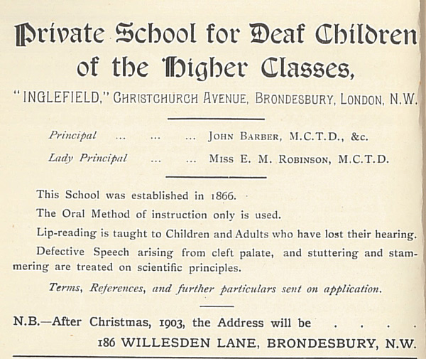 Barber advertised his establishment as 'a private school for children of the higher classes', and 'the oral method of instruction alone is used'. No sign language was taught but lip reading was taught.