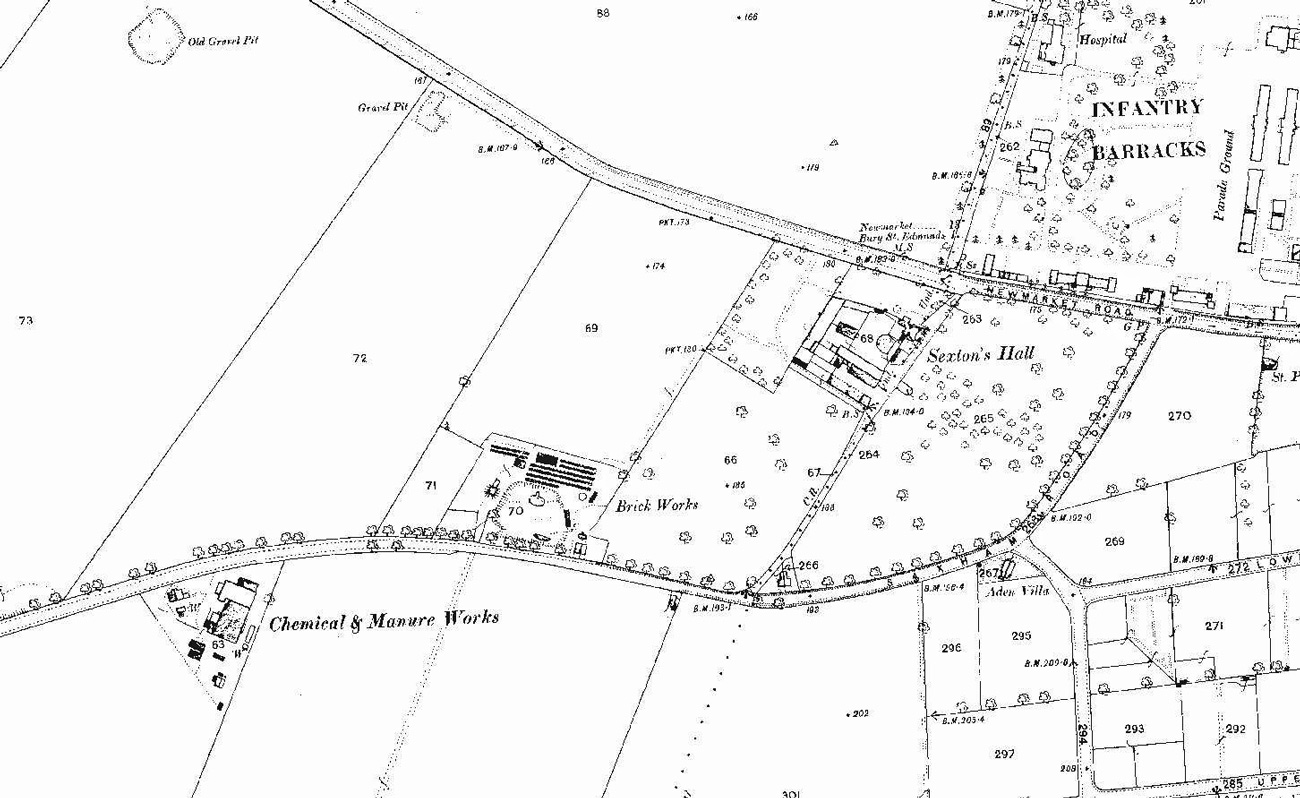 At this time the factory was in the parish of Westley, being just outside the pre-1934 borough boundary. Today the site would have the address of Westley Road, Bury St Edmunds. Please click on the thumbnail to see a wider view of the locality.