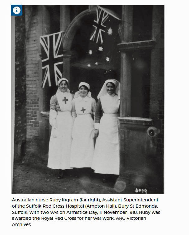 Sister Ruby M Ingram was an Australian who served with the British Red Cross and the French Red Cross, which I believe was operated as part of the British Red Cross, writes one of her descendants, Monica Lockheed. Her medal index card shows that her British War and Victory Medals were issued for war service with the French Red Cross. The abbreviation is FRX. She received a Royal Red Cross 2nd Class in April 1919 at Buckingham Palace for her war service.