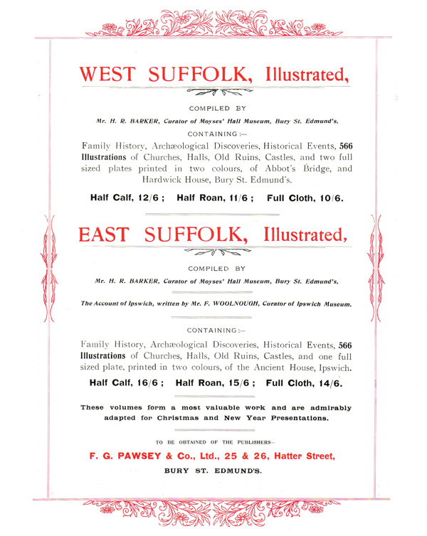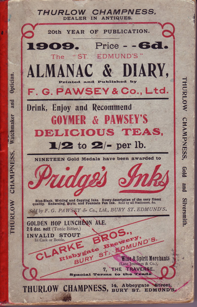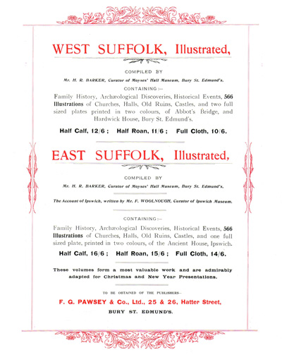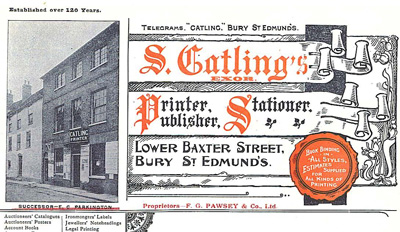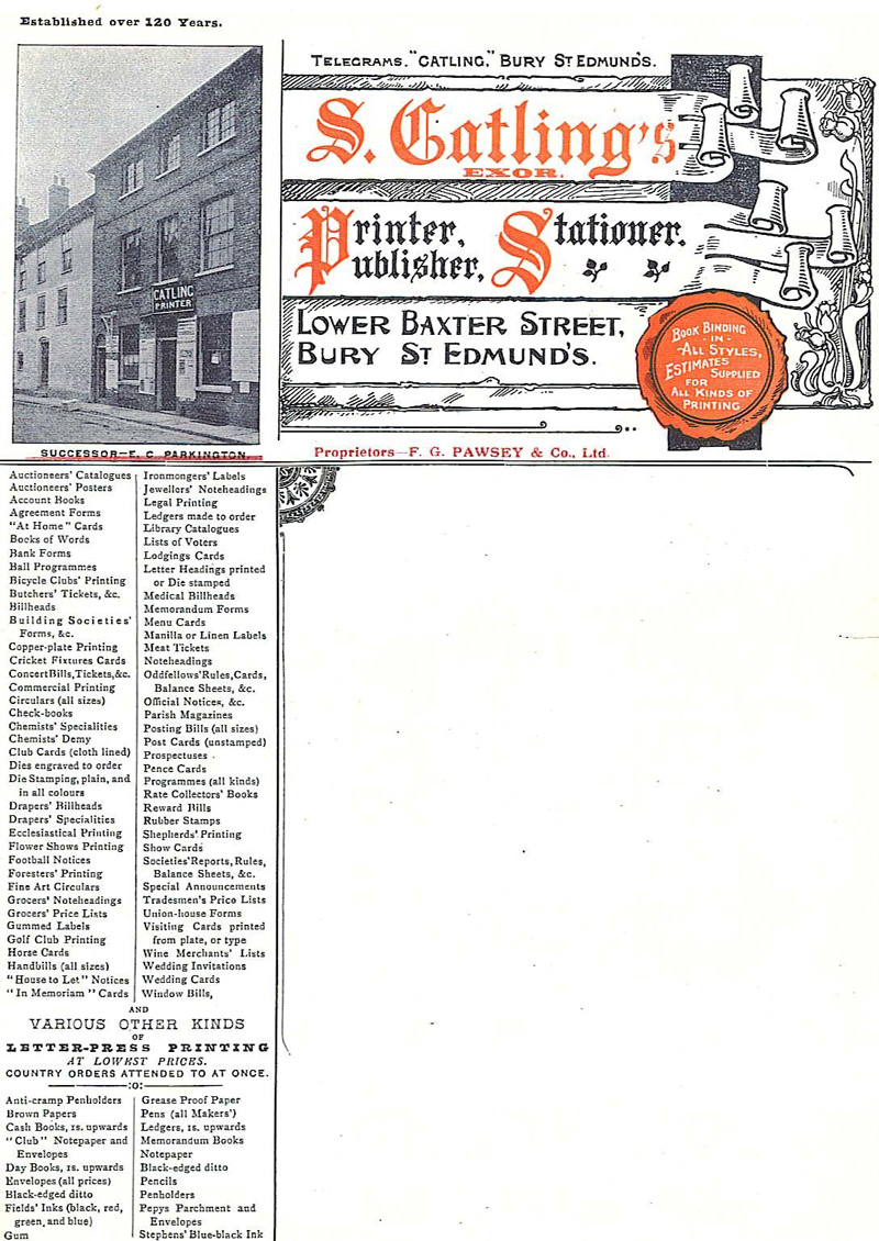Since there is no entry in the 1885 White’s Directory for Mrs. Barker at 26 Hatter Street, it appears that F.G.Pawsey commenced in business that same year at 26 Hatter Street having acquired the business from Mrs. Barker and thirteen years later, bought the property from the executors of Johnson Gedge, (the deceased partner of Gedge & Barker) who had retained ownership of the property. The property was auctioned on January 6th 1898 at the Angel Hotel, Bury St. Edmunds and F.G. Pawsey and Frederick Cater were the highest and successful bidders at £760.