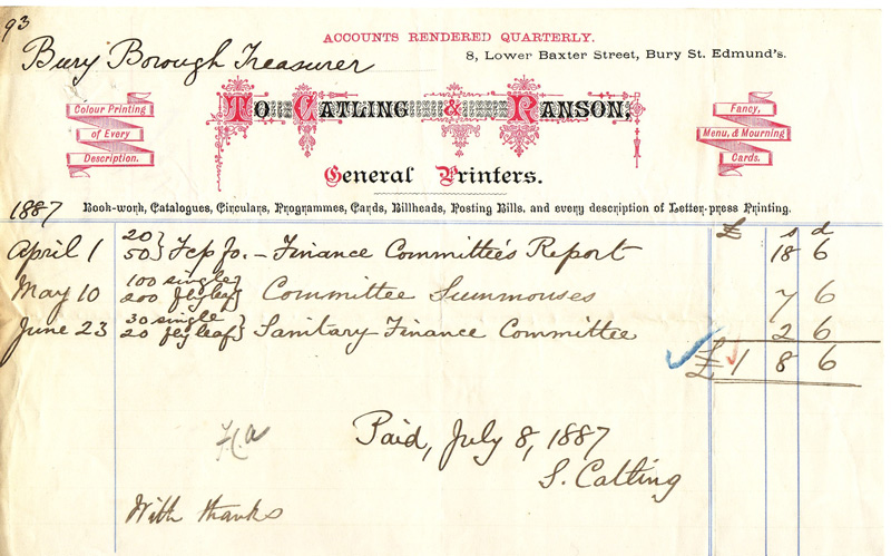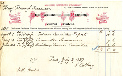 We also know this from the 1885 edition of White’s Suffolk Directory which lists: Mrs. Emily Lydia Barker, General Printer, 7 Lower Baxter Street and 3 Guildhall Street; with her home address still at 39 Northgate Street.