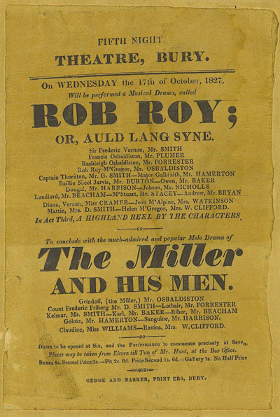 Illustrated here is a theatre bill advertising the play “ Rob Roy” Wednesday 17th October 1827, which was printed by Gedge and Barker, printers, Bury, in 1827. Peter Gedge had died in 1818 and his place in the firm of Gedge and Barker was taken by his second son, Johnson Gedge.